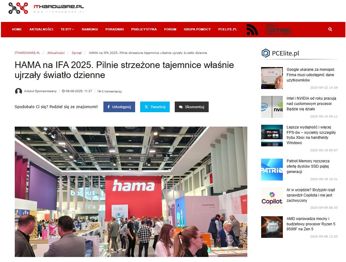 W sieci w przypadku marki Hama ukazało się łącznie 25 publikacji, z czego 10 były to zapowiedzi premier na stoisku, a pozostałe to dłuższe lub krótsze relacje w formie pisanej czy też wideo. Spośród największych wymieńmy: Telepolis.pl (8,8 mln OTS – średnia liczba odsłon miesięcznie), Android.com.pl (2 mln), Instalki.pl (750,7 K), Tabletowo.pl (440 K, również na kanale na YouTube, 47,6 K), GSMManiak.pl (2,3 mln), ITHardware.pl (947,8 K), a także kanale na YouTube Technostrefa (1,09 mln),